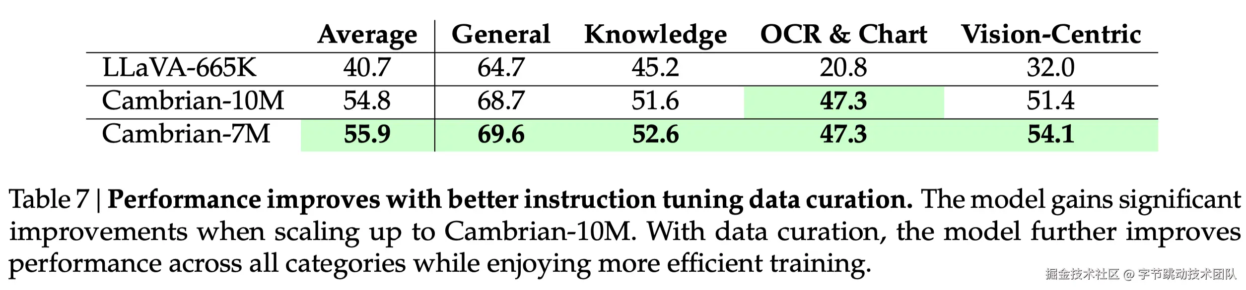 - 基于Cambrain-10M,调整了垂类的配比,得到了更精简、更高质量的数据集Cambrain-7M;和10M版本的对比如下,7M训出来的模型效果更好;