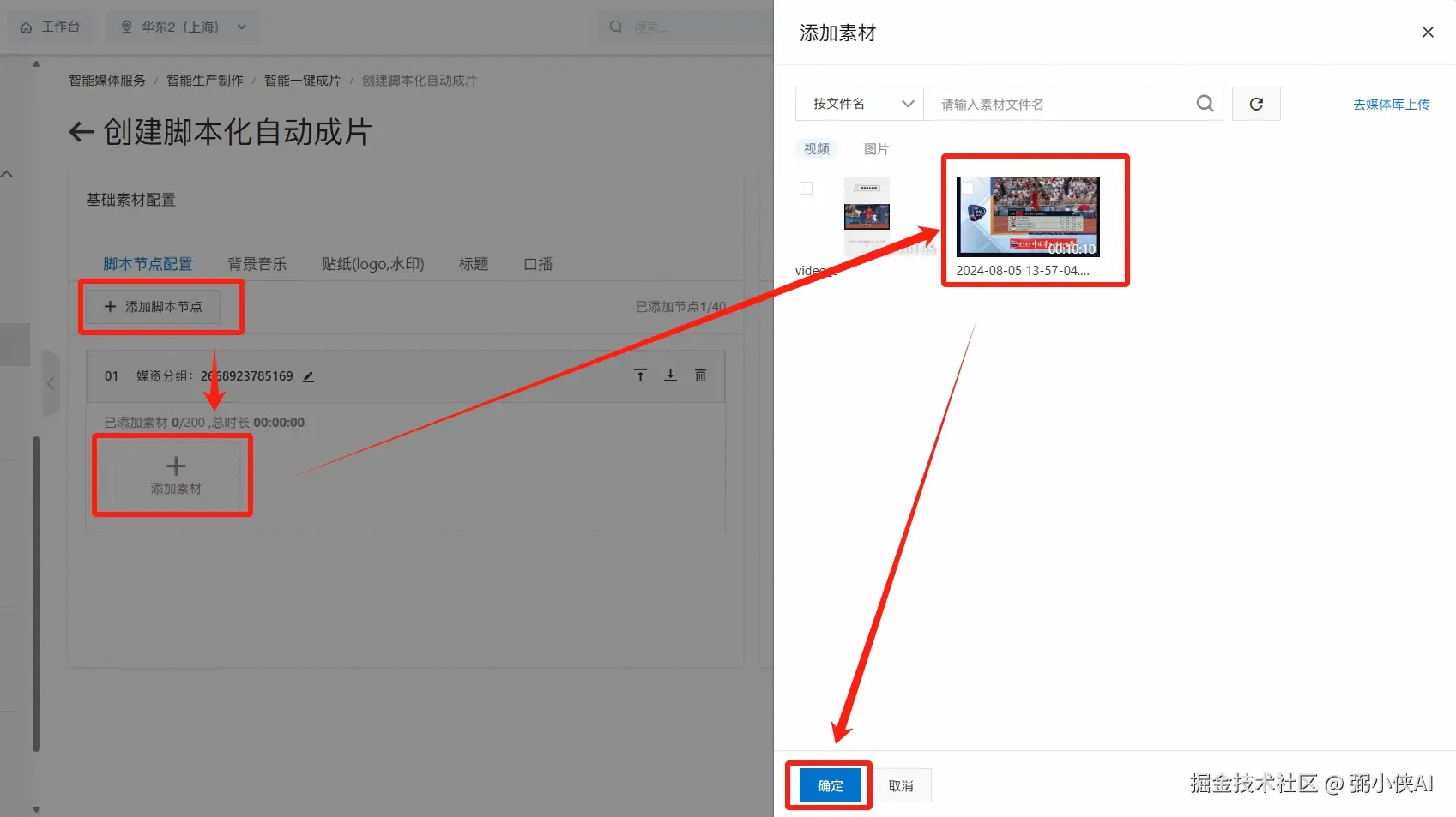 - 在脚本节点配置区域,添加脚本节点,设置节点描述并关联节点媒资(必填);