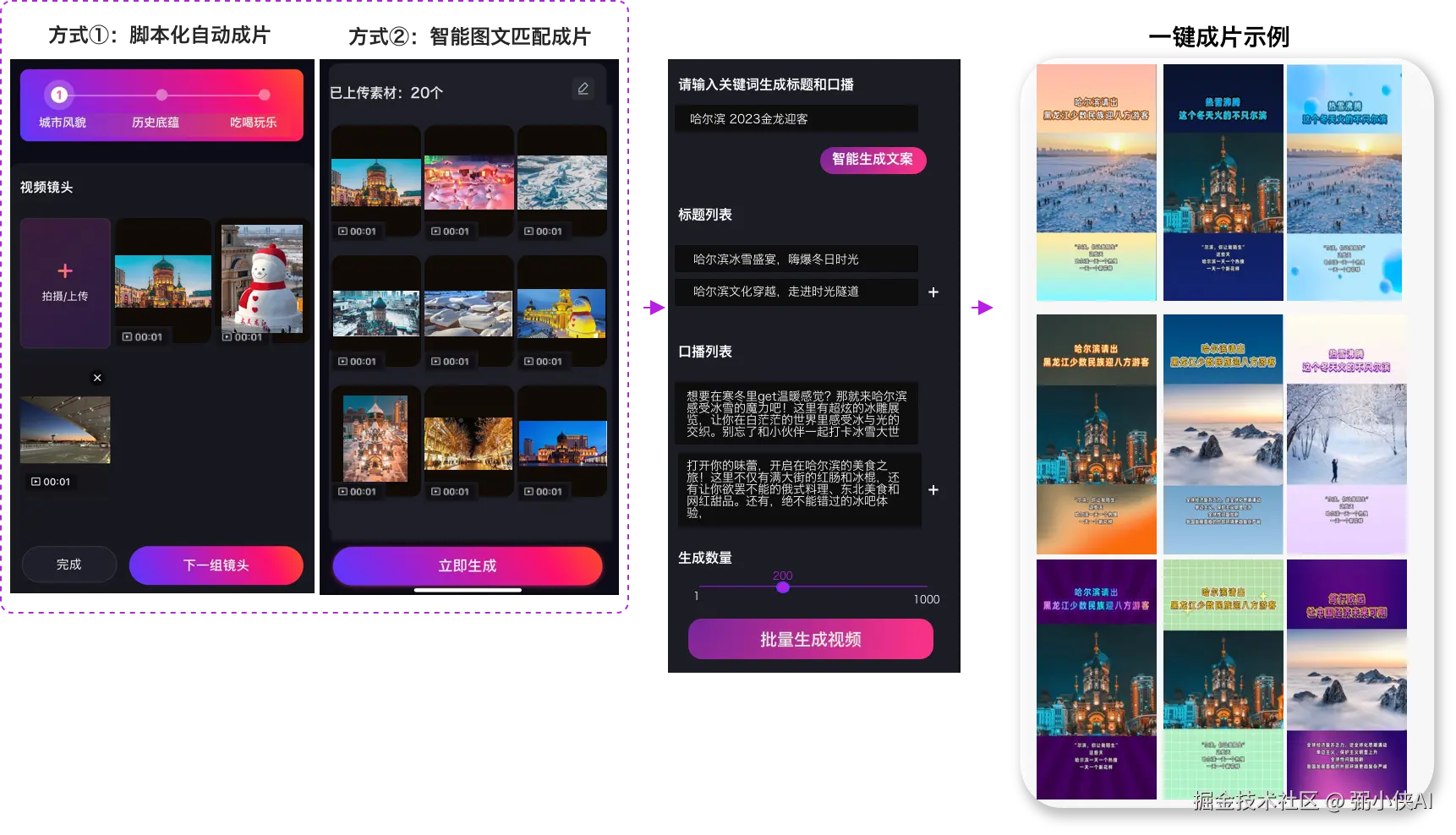 如上面左①图所示,视频预期介绍哈尔滨旅游,视频结构明确为“城市风貌”、“历史底蕴”、“吃喝玩乐”,每个节点关联对应的图片/视频素材,系统将按照结构顺序整体排布,各节点随机选择素材,搭配口播文稿,进行时长自适应,一键批量生成成百上千个不同的视频。