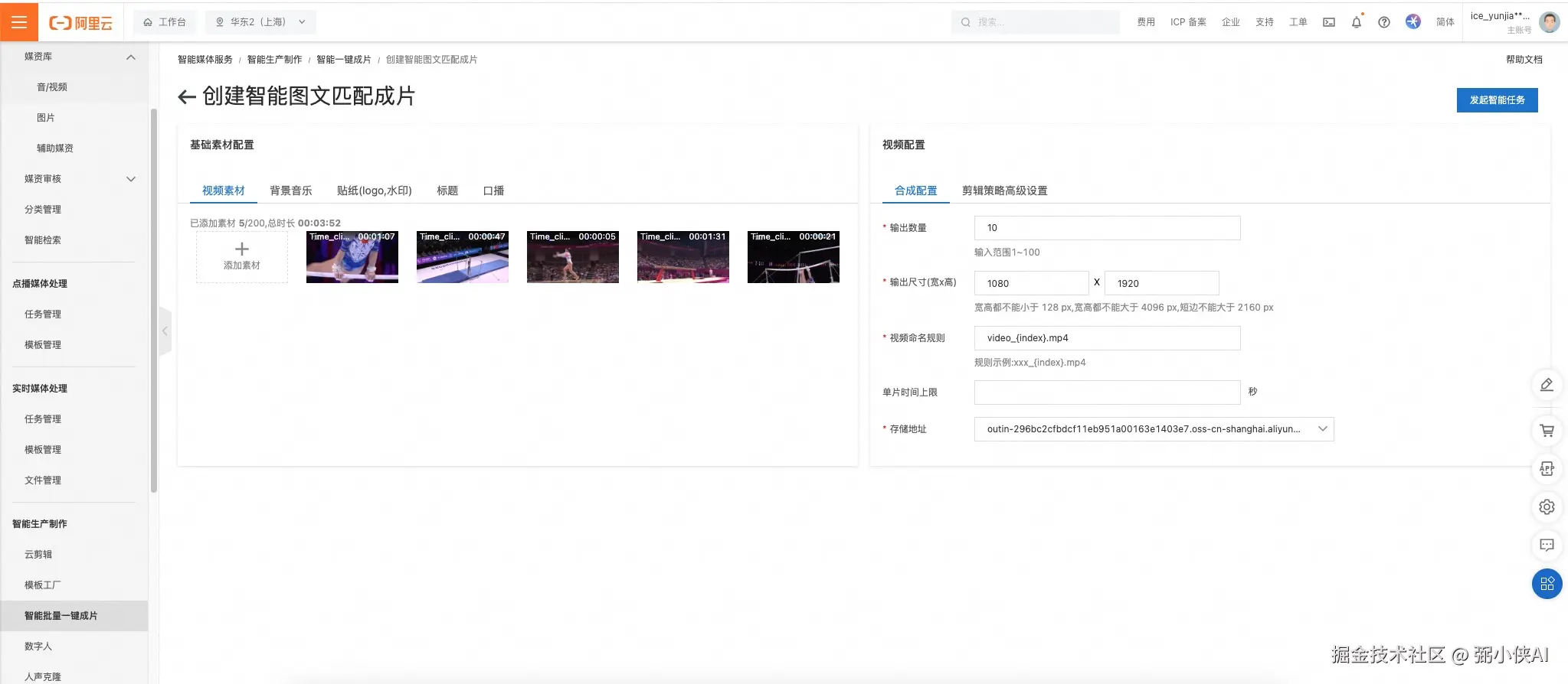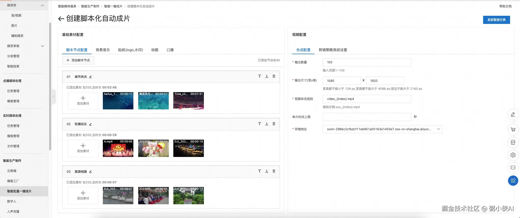 - 在合成配置区域,填写预期合成数量、合成文件命名规则、合成存储路径等,即可发起脚本化自动成片任务(必填); 这部分设置需要根据视频发布渠道而定,比如短视频平台,设置输出尺寸为1080X1920;