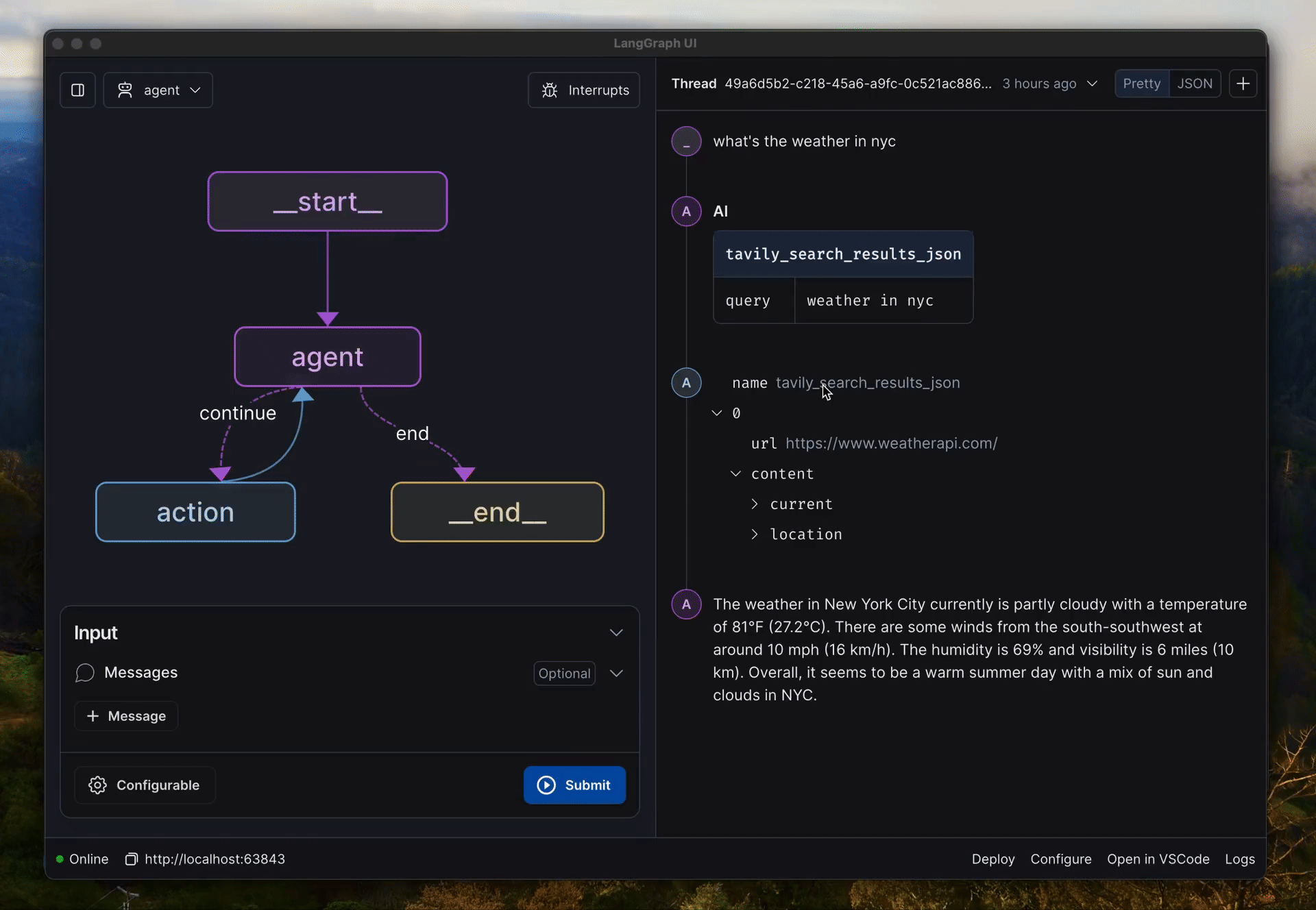 一旦您选择一个有效的项目,LangGraph Studio 将启动一个 LangGraph API 服务器,您应该会看到一个呈现了图形的 UI。