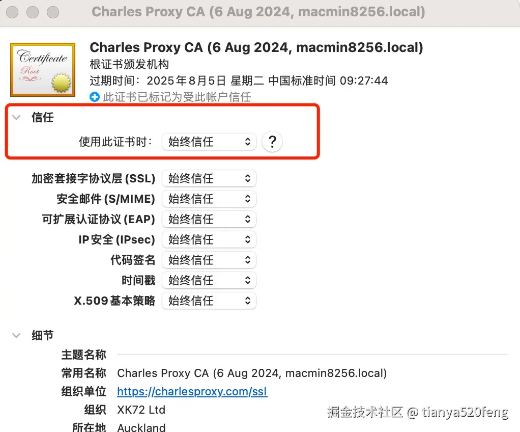macOS charles ssl证书有效期是一年,到期后需要更新。可以在钥匙串中删除原有的charles证书,然后在 charles 的 Help ->SSL Proxying->Reset Charles Root Certificate 进行重置。然后在 Help ->SSL Proxying-> Install Charles Root Certificate 进行安装,这时会打开钥匙串,找到Charles证书,然后双击证书,展开【信任】选项,在“使用此证书时”选择“始终信任”。
