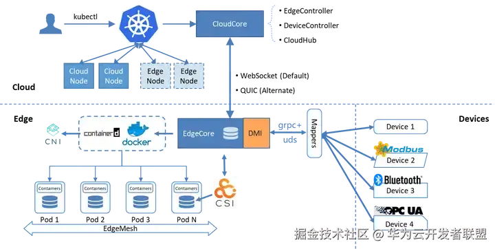 - 边缘物理设备管理。KubeEdge利用设备管理插件Mapper以云原生化的方式纳管边缘设备。用户能够定义设备配置文件,以Kubernetes自定义资源的方式云原生化管理边缘物理设备。