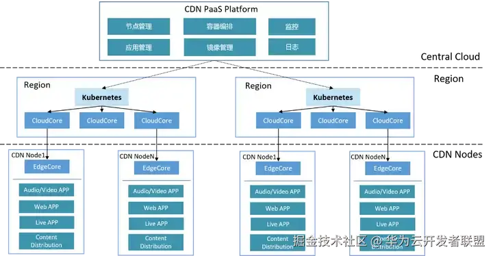 基于KubeEdge的大规模CDN节点管理平台架构如下图所示。需要在各区域中心及数据中心建若干个Kubernetes集群,这些中心具有全量Kubernetes能力,包括负载均衡、网络插件相关能力,能够满足业务部署在中心云的需求,例如区域的日志汇聚、监控汇聚、镜像分发加速的能力,除了传统Kubernetes组件,在区域中心还部署了KubeEdge的云侧管理面组件cloudcore,通过cloudcore纳管边缘的CDN节点,边缘CDN节点全部以edgecore的形式,就近接入区域云端。