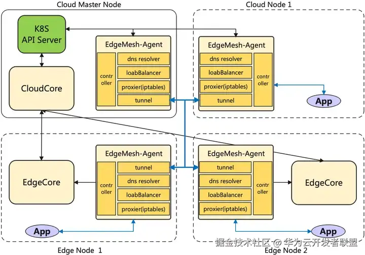 - 内部DNS服务器。Edgemesh内部实现轻量级的 DNS 服务器,让域名请求在节点内闭环。这一特性主要针对边云连接不稳定的情况,目的是在边缘节点与云节点断开连接后也能正常完成域名解析。