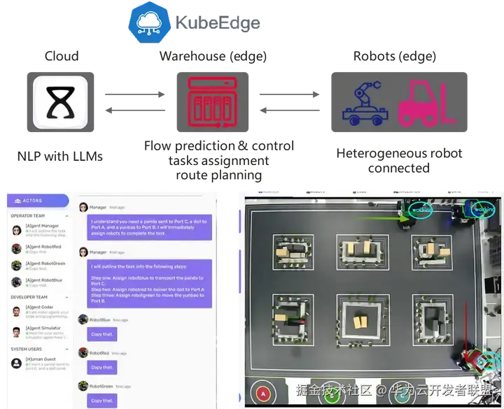 基于KubeEdge的多云原生机器人编排系统架构如图所示,主要分为云端大脑、边侧小脑、端侧机器人躯干。云端大脑部署大语言模型,能够按照用户指令自动生成机器人的控制代码并下发边侧小脑;边侧小脑具有机器人的一些基本技能,例如3D环境感知、路径规划、实时定位与导航,能够控制机器人完成移动、抓取;端侧机器人躯干具有众多传感器,能够向云端大脑、边侧小脑反馈状态,更新系统。