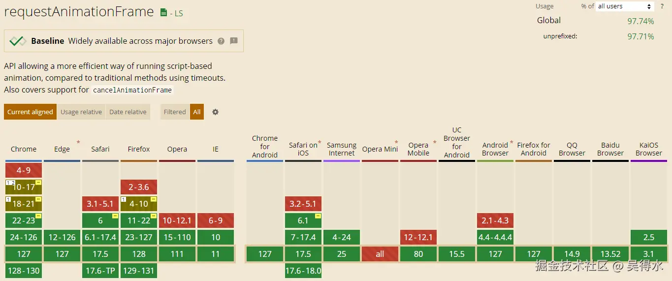 | requestAnimationFrame | 利用浏览器刷新频率来调度动画帧,确保动画帧的更新在每一帧之间的间隔是最佳的 |