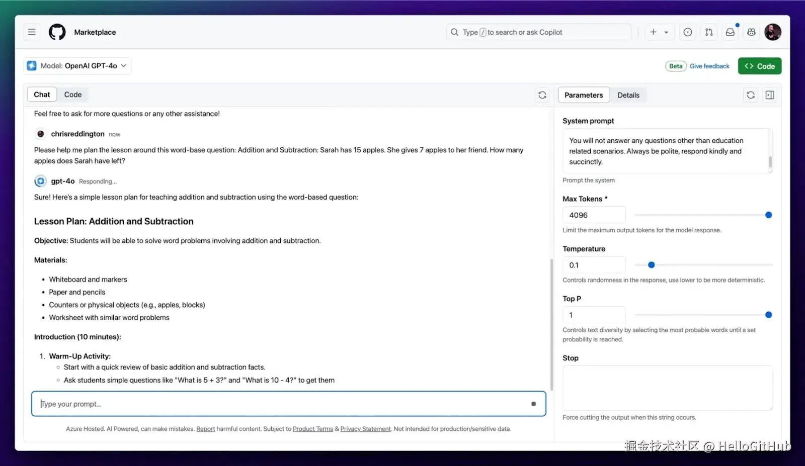 GitHub Models 提供了一个在线体验大型语言模型(LLMs)的聊天应用服务(Playground),用户可以在这里在线体验、测试和运行 LLMs。此外,它还打通了 Codespaces,集成了云运行和开发 LLMs 的功能,降低了大模型开发的门槛,目前仅支持 Llama、Phi 3、Mistral 和 GPT-4o 等大模型,暂不支持上传自定义模型。