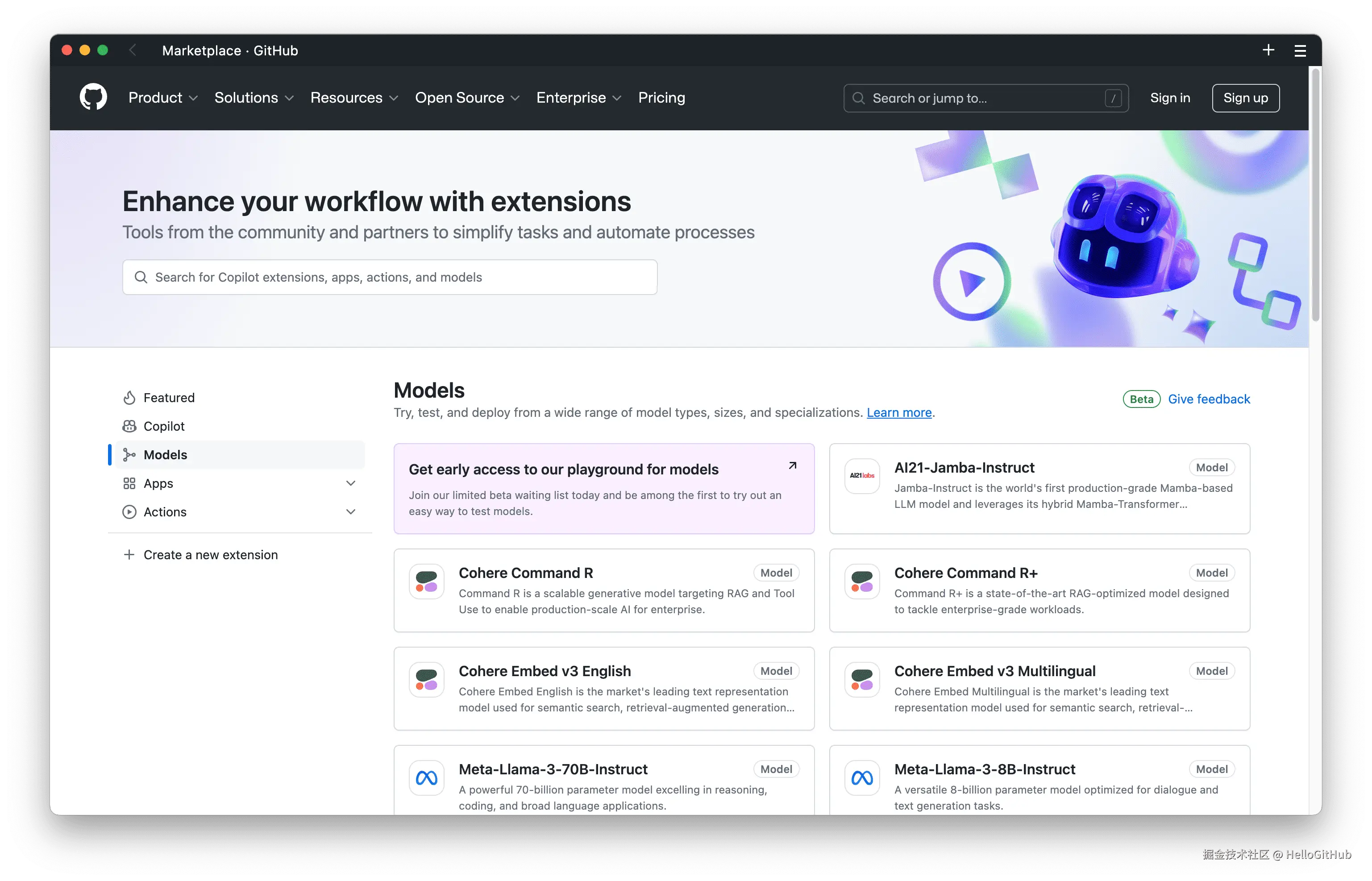 众所周知,本地运行 LLMs 需要下载模型(体积大),并且还比较吃硬件配置。近日 GitHub 推出了 GitHub Models 服务,让开发者可以在 GitHub 上免费测试 Llama、Phi 3、Mistral 和 GPT-4o 等大模型。但是,目前该服务仍处于公测阶段,类似早期的 Copilot,并未完全开放。需要先提交申请(waitlist)等待审核通过后才可以使用。