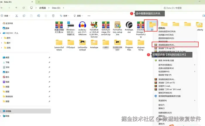 在文件资源管理器里,鼠标右键存有重要文件的文件夹,选择【添加到压缩文件】即可。