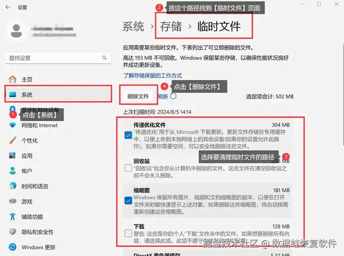 打开电脑【设置】,找到【存储】功能,点击后选择【临时文件】,进入【临时文件】页面后,就能够看见计算机系统已经扫描好的临时文件,在进行路径选择删除即可。