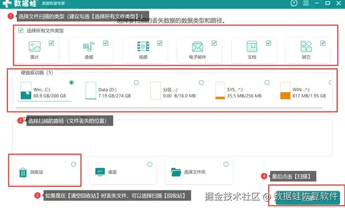 数据 蛙恢复软件具有强大的文件扫描恢复功能,它支持我们办公学习上会用到的大多数文件类型;同时能够兼容大多数系统,windows7/8/10/11等系统都能够运行该软件;它还提供扫描文件预览功能,帮助大家更快更精准地找到自己需要恢复的文件。那这款软件该怎么使用呢?具体步骤如下: