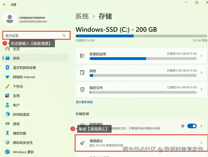 同样打开电脑【设置】,在搜索框输入【磁盘清理】,点击【磁盘清理建议】后进入【存储】页面后点击【清理建议】即可。