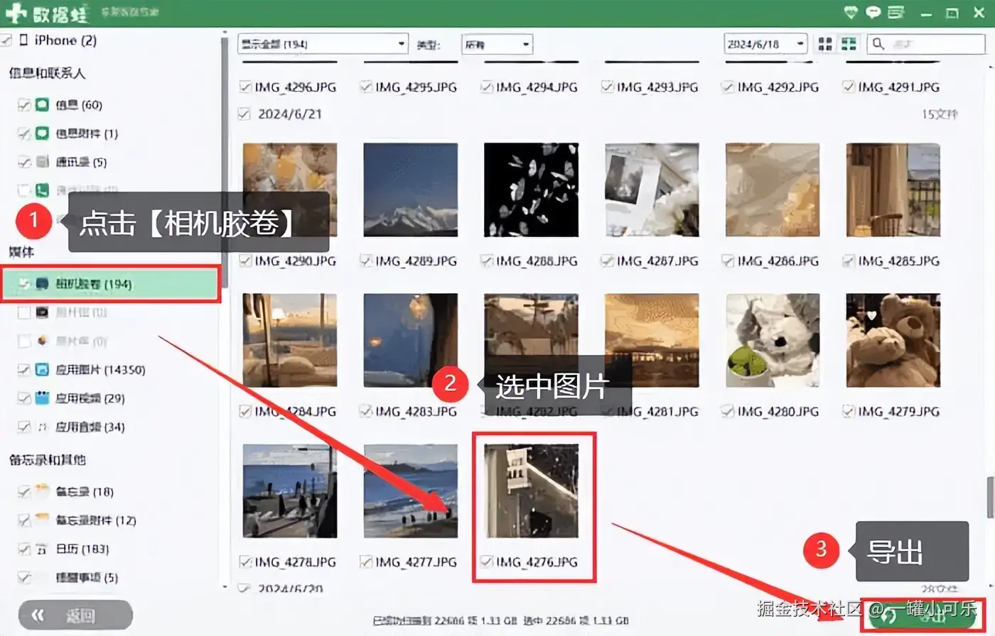 步骤2:扫描完成后,你可以浏览并预览扫描出来的可恢复的照片,选中照片后,点击 【导出】 按钮即可。