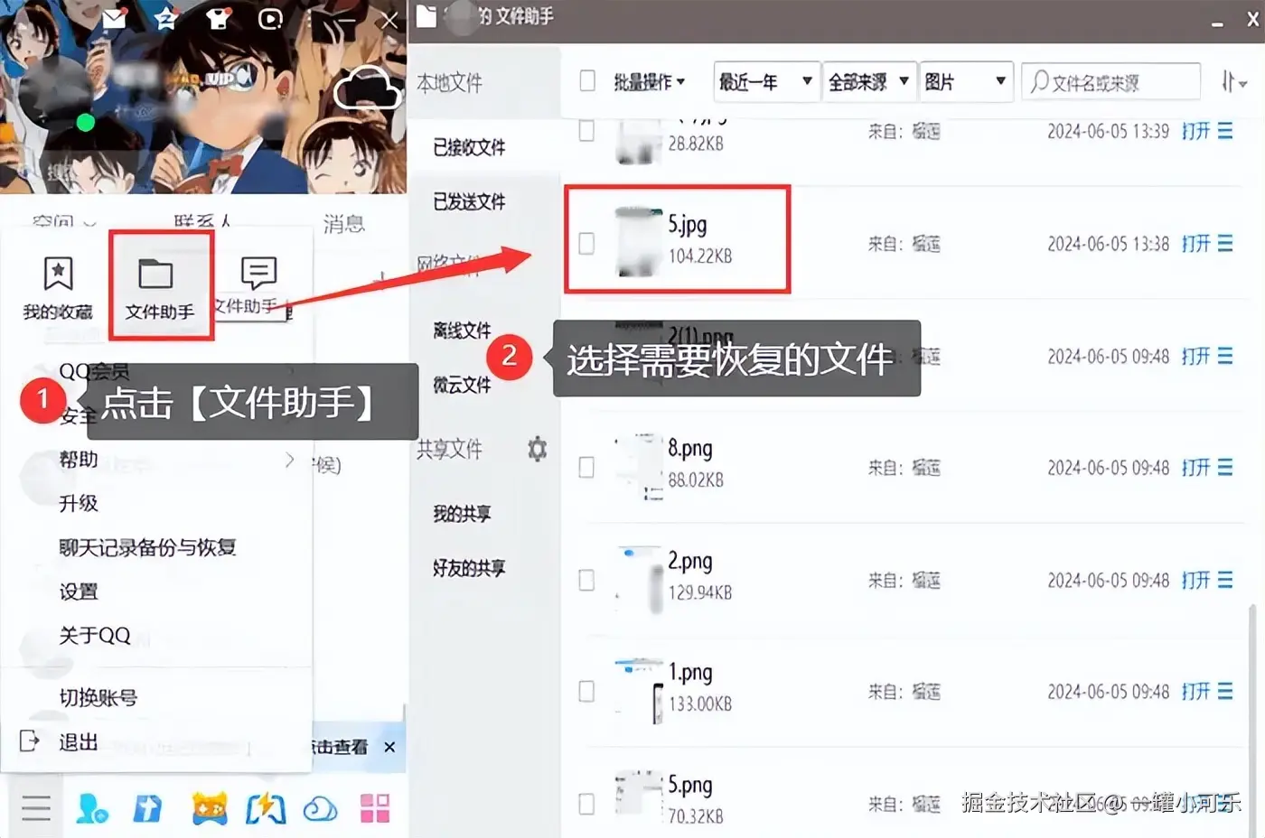 恢复步骤:打开QQ,点击菜单栏,选择文件助手,然后勾选需要恢复的文件,点击查看即可。