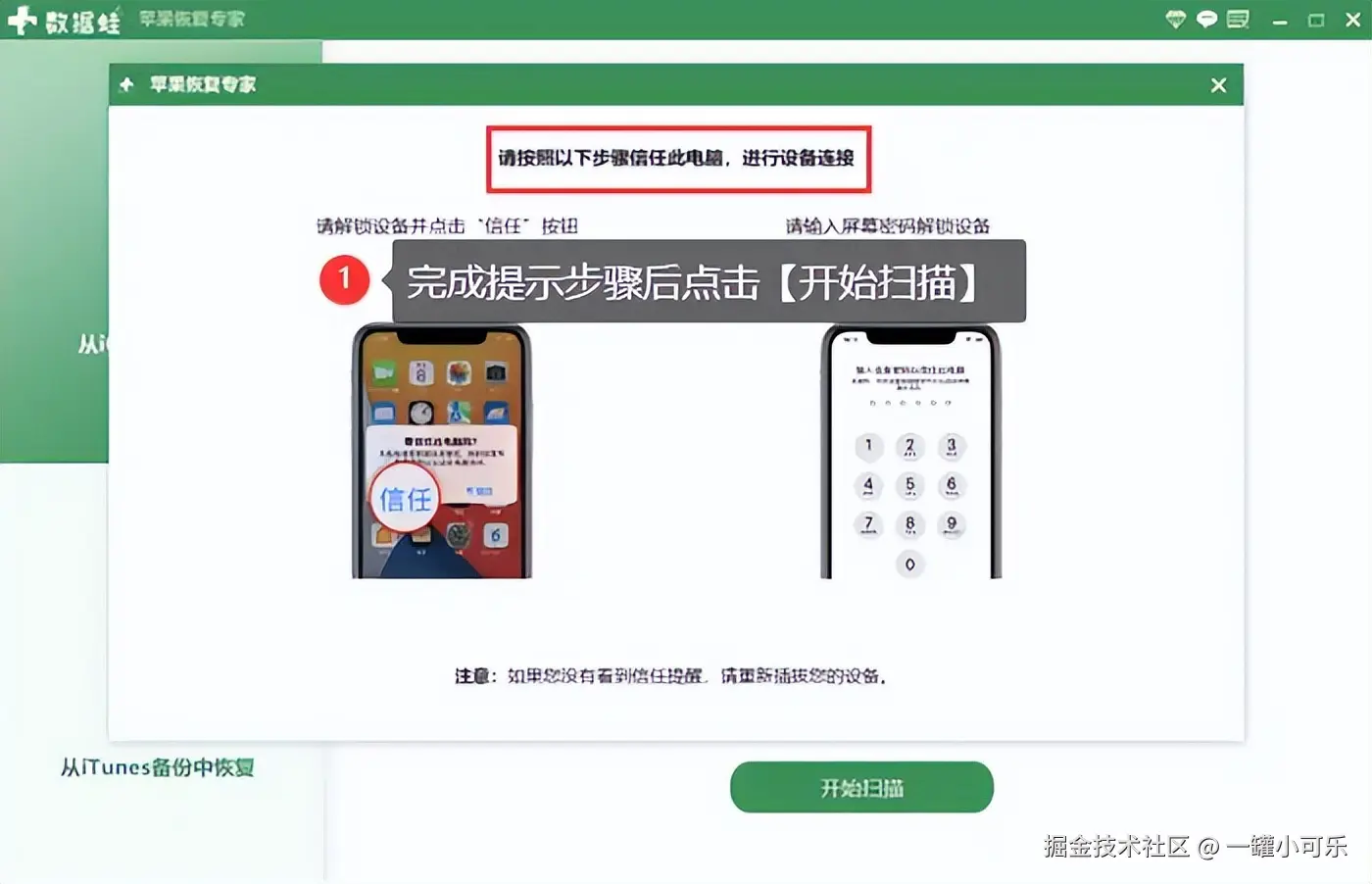 步骤1:按照提示完成软件安装,使用USB线将你的苹果设备连接到电脑。当手机跳出 【是否信任该电脑】 的提示时,点击 【信任】 并输入密码即可。