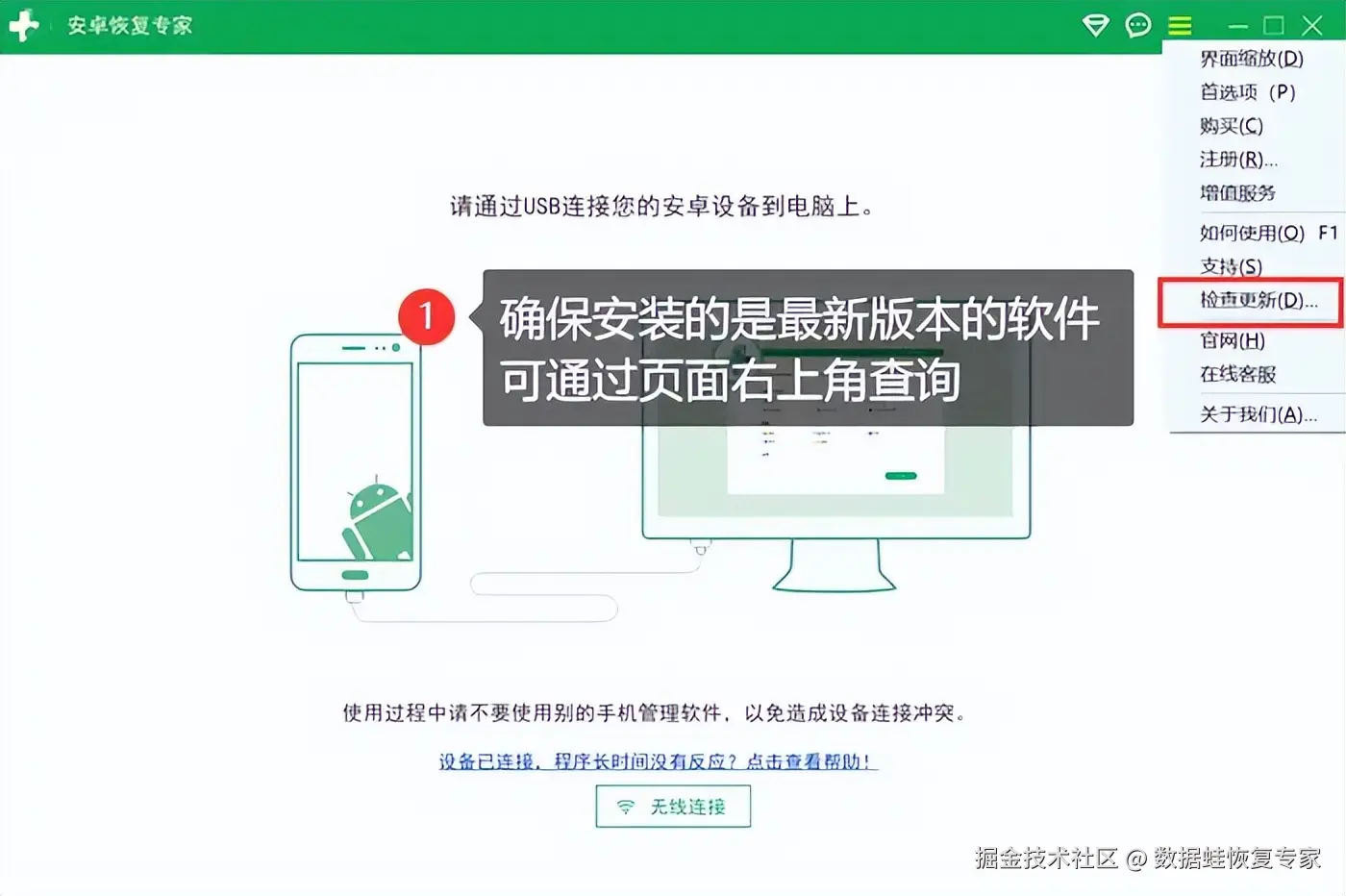 步骤1:下载安装最新版本的软件,然后使用数据线连接手机和电脑。如果不确定是不是最新版,可以在首页右上角检查更新。