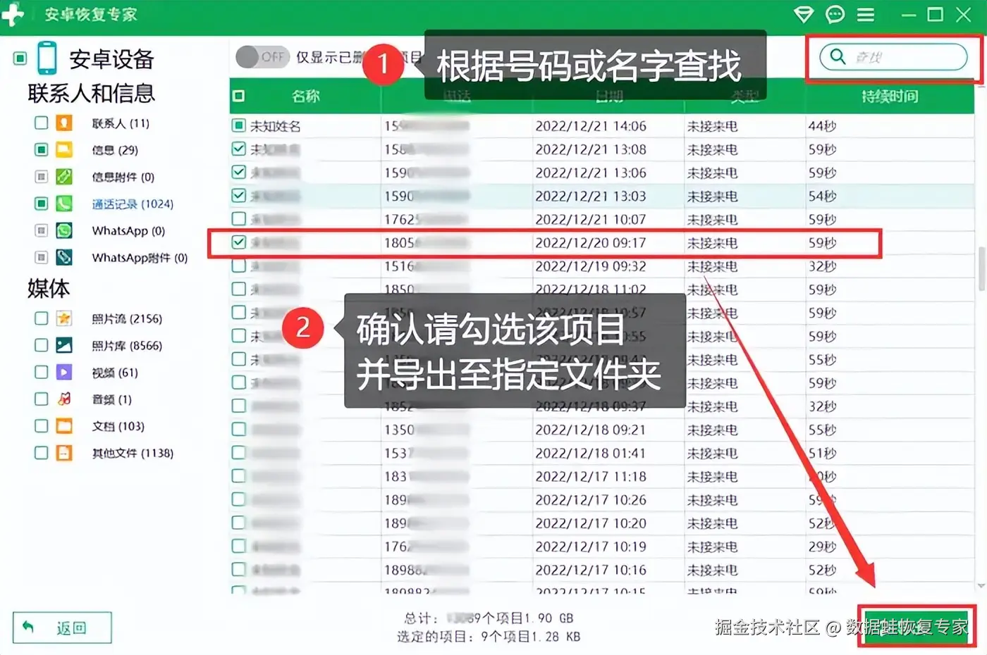 步骤3:我们可以根据号码、名字、日期等信息进行搜索,找到需要找回的数据后,将通话详单导出,选择安全位置进行恢复。