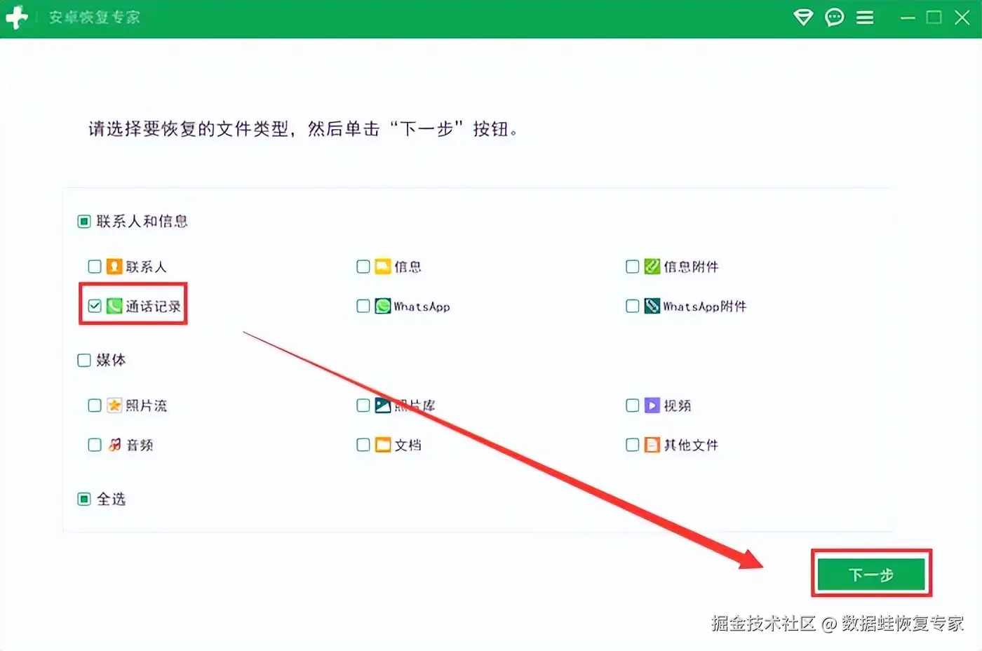 步骤2:连接成功之后,根据自身情况选择合适的扫描对象。例如本文探讨的是通话记录的恢复,则勾选相应的选项。接下来就可以开启扫描啦!