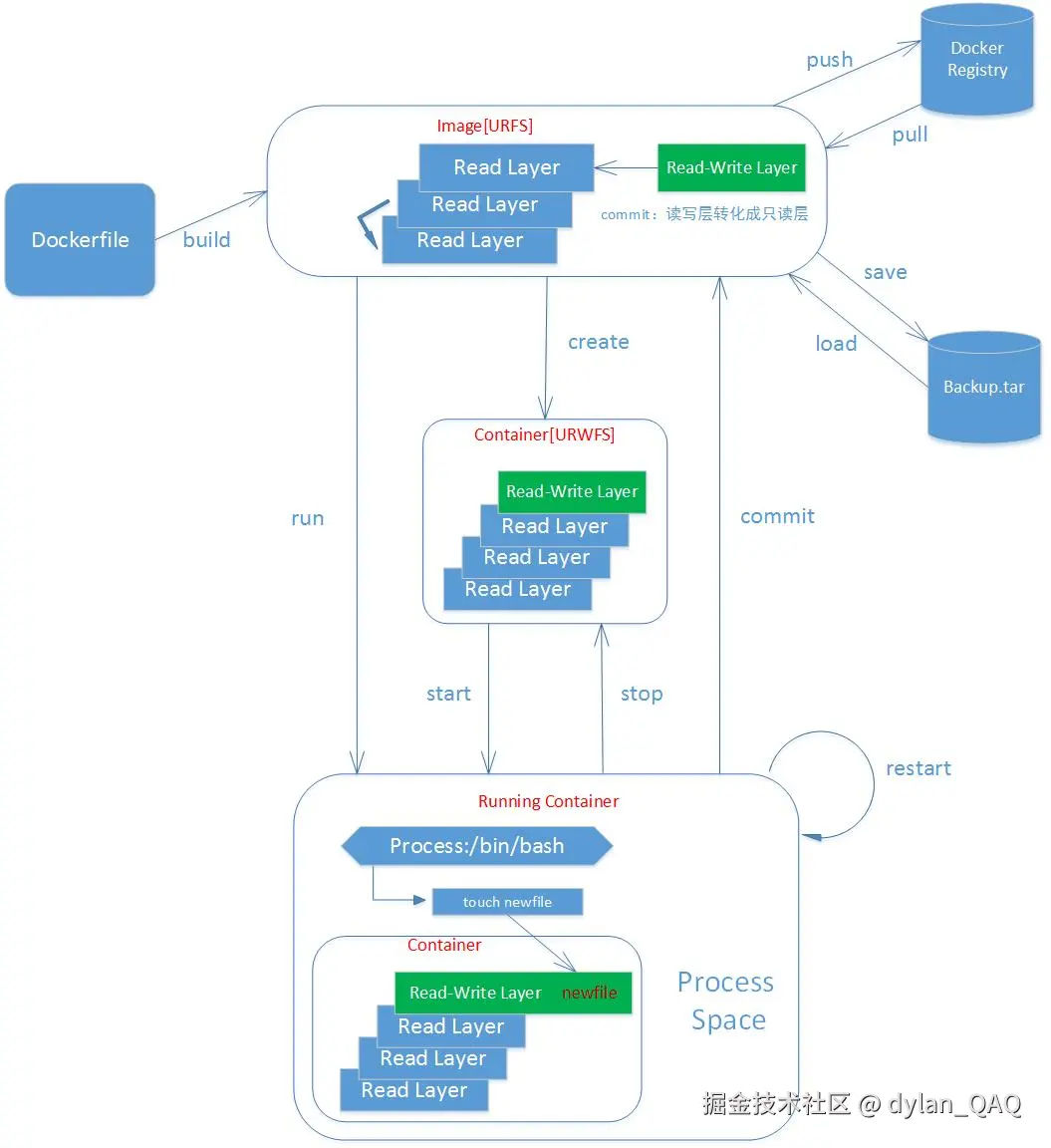 即为可读写文件系统添加一个进程空间【包括进程】,生成动态容器【running container】