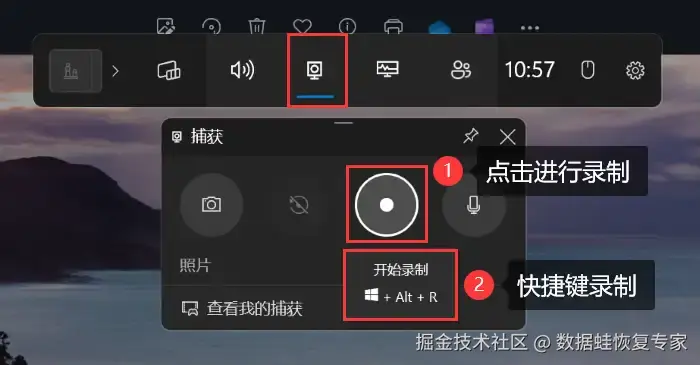 步骤2:在Xbox Game Bar中选择 【录制】 选项,点击 【圆形】 按钮进行录制。