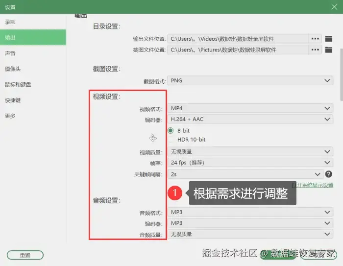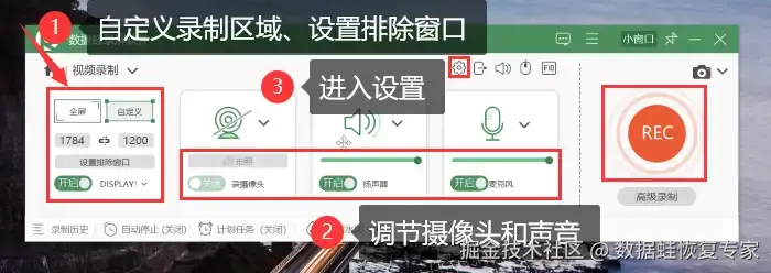 步骤3:进入 【视频录制】 页面,可以对录制区域、排除窗口、摄像头、声音等进行调节。如果对视频有不同的要求,可以点击进入 【设置】 中对视频音频的输出格式或质量进行调整。返回录制页面点击录制按钮即可进入录屏。