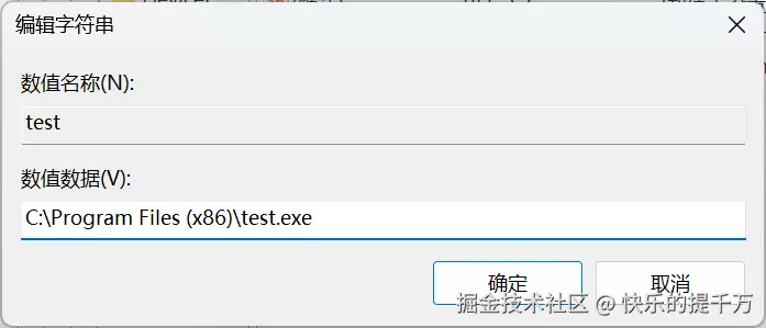 - 然后打开,在“数值数据”里填写程序的默认路径要加英文格式的双引号,比如:"D:***.exe"