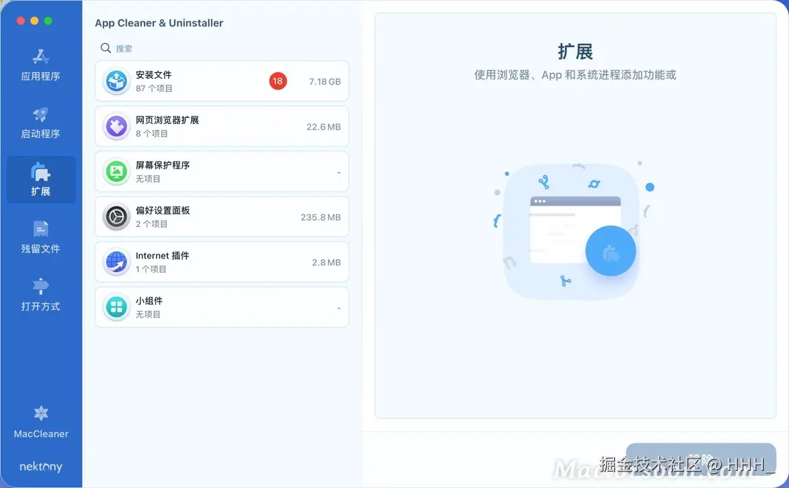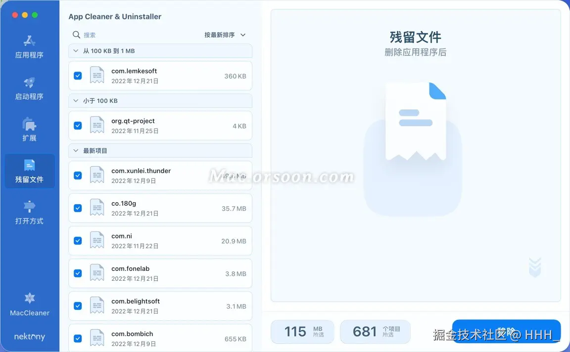 App Cleaner & Uninstaller for Mac是Mac平台上一款非常受欢迎的清理卸载工具,App Cleaner & Uninstaller mac版可以深度的卸载清理某一个应用,删除软件的同时还能一并清理软件生成的配置文件、依赖文件等,另外App Cleaner & Uninstaller中文版还支持管理macOS开机自启动程序的管理、扩张管理等功能。使用App Cleaner&Uninstaller,您只需将应用程序拖放到应用程序界面即可轻松卸载应用程序。它将扫描并显示所有关联的文件,如首选项、缓存和支持文件,允许您查看和选择要删除的文件。App Cleaner&Uninstaller中文版还包括一个名为“SmartDelete”的功能,可以监视应用程序的删除并提示您自动删除相关文件。这有助于防止系统中积累不必要的文件。此外,App Cleaner&Uninstaller允许您管理启动项目、浏览器扩展和系统扩展。您可以禁用或删除可能会降低Mac性能的不需要的项目。 复制到浏览器打开即可:a.d4t.cn/LyUXXF