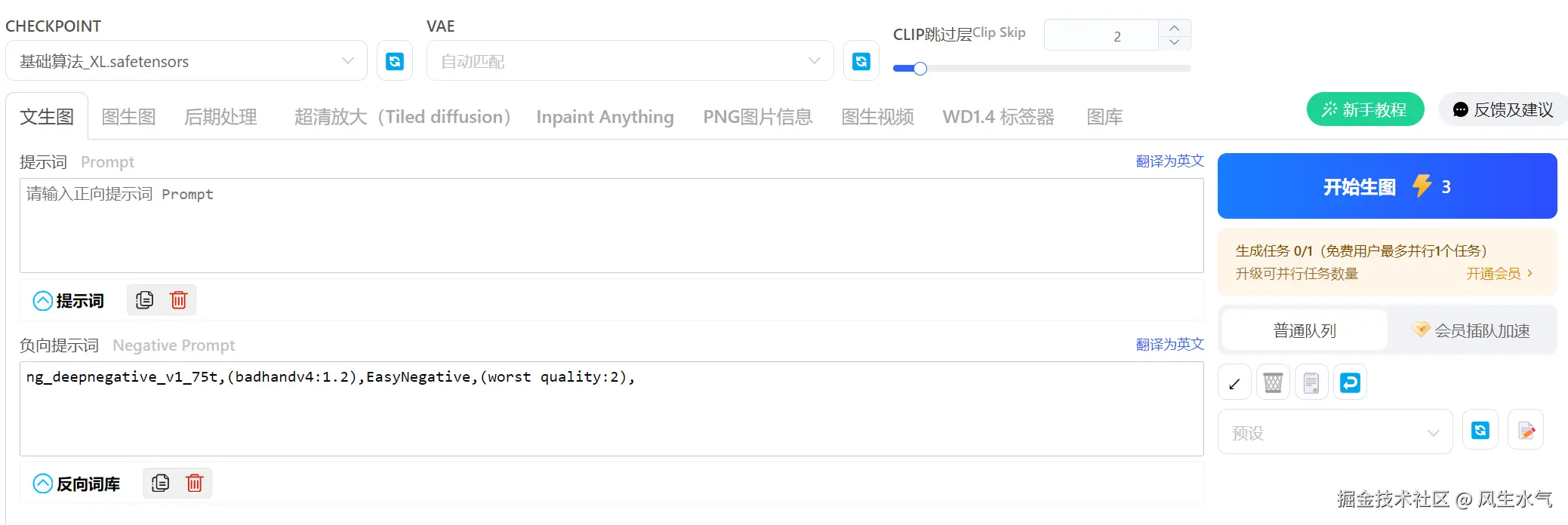 - 提示词:这个是文本生成图片的关键,提示词中描述的越详细,生成的图片质量就越高。
