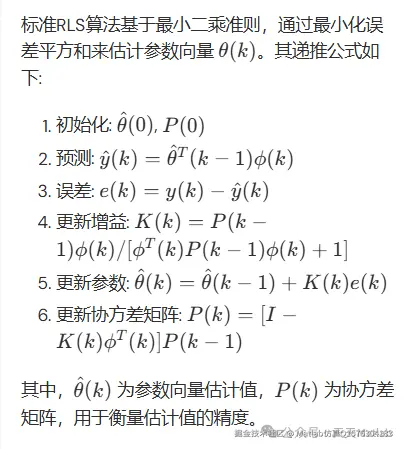 为了解决这一问题,人们引入了指数遗忘因子,将其融入RLS算法,形成了基于指数遗忘的递归最小二乘(ERLS)算法。该算法通过对历史数据赋予不同的权重,有效地提高了算法对参数变化的跟踪能力,使其更适合于时变参数系统的参数辨识。