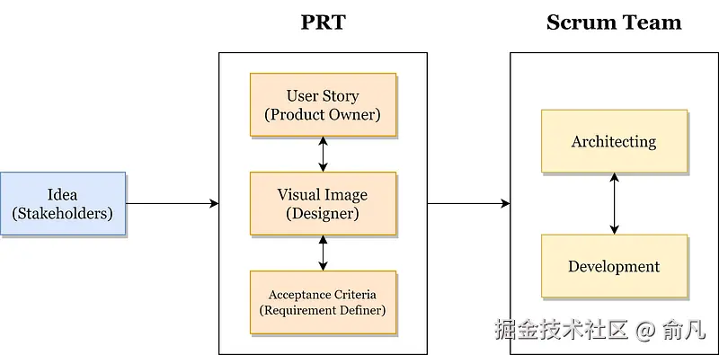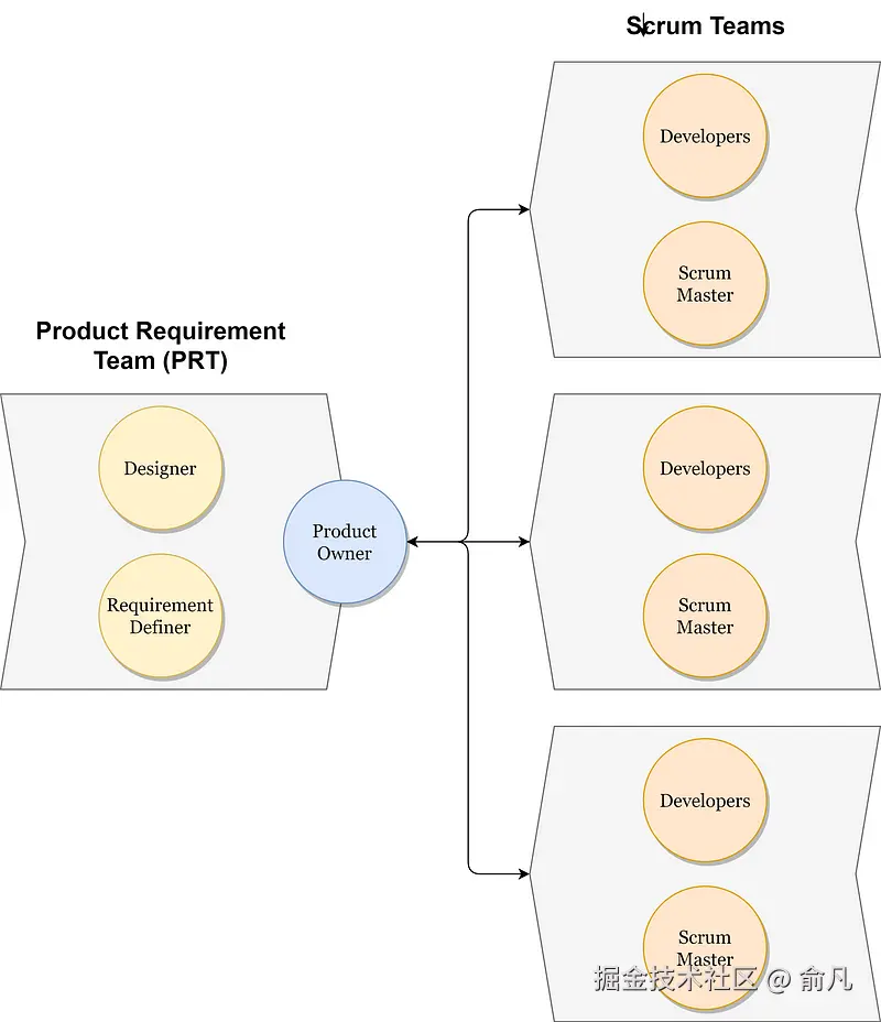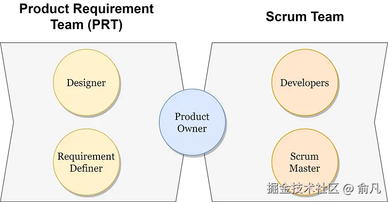 PRT 负责需求定义并将其正确传达给开发人员。PRT 由产品负责人、需求定义者和设计者组成。下图展示了 PRT 与 Scrum 团队的组成。