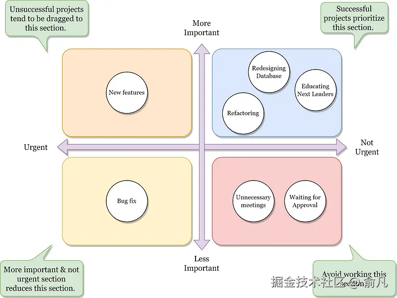 业务驱动型敏捷采用“延迟满足”和“耐心”,从长远角度思考和决策,因为软件项目通常是长期的,而长远思考会带来成功。例如,人们往往会被拖着开发新功能,认为这是“即时满足”,而拖延重构、重新设计数据库和基础设施,或教育下一任领导者。虽然后者不能立竿见影,但从长远看,它们会产生巨大影响。下图是“影响力矩阵(Impact Effort Matrix)”,描述了在短期和长期内哪些是重要的,哪些是不重要的。