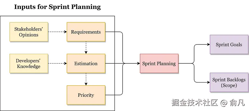 Sprint 计划是团队确定 Sprint Backlog 的地方,Sprint Backlog 是选定的 PBI(Product Backlog Items,产品待办事项),预计在即将到来的 Sprint 中完成。换句话说,在敏捷中,范围是根据 Sprint 来控制,而 Sprint Backlog 就是 Sprint 的实际范围。需求、估算和优先级应被定义为确定 Sprint Backlog 的输入。这意味着团队不仅要确定需求,还要在前一周确定估算和优先级。由于这些要素相互交织,因此通常需要来回讨论。下图说明了 Sprint 计划的整体流程。