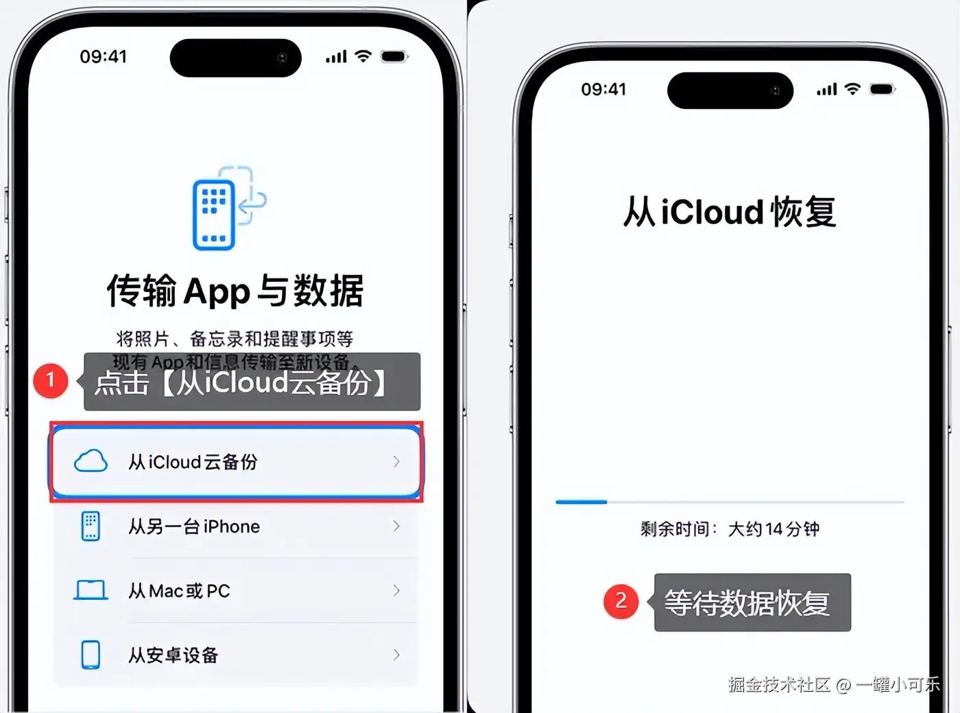 第2步:根据屏幕提示,进入 【传输APP与数据】 ,登录Apple ID选取备份进行恢复即可。