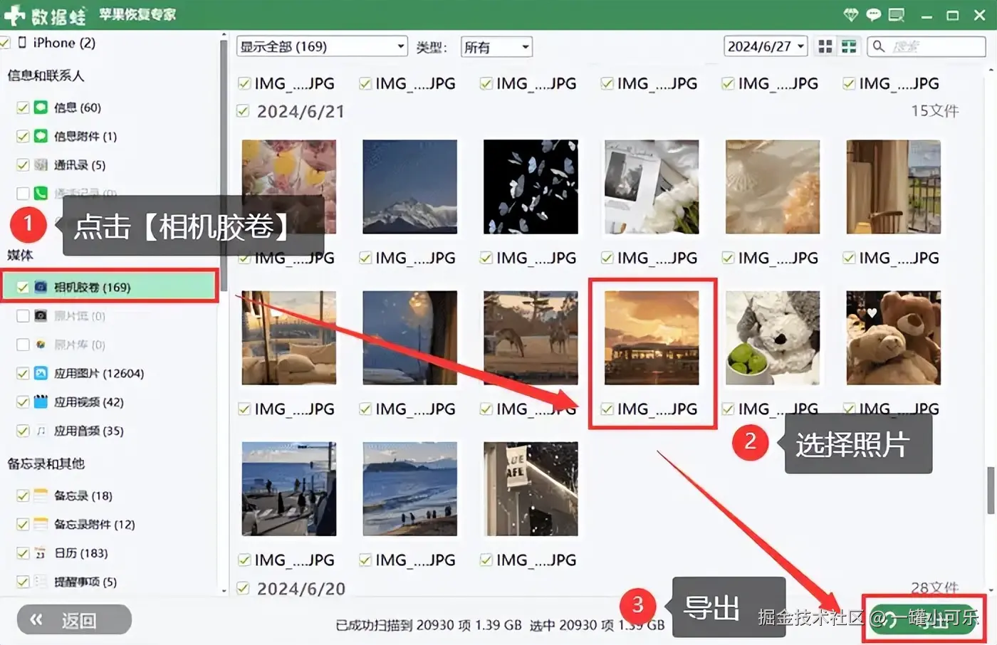 第3步:扫描结束后,浏览检查这些数据,选择你希望恢复的照片、视频、短信、联系人等。你可以使用筛选功能来帮助你更快地找到所需数据。选中所需数据后,点击 【导出】 按钮。下图以恢复图片数据为例。