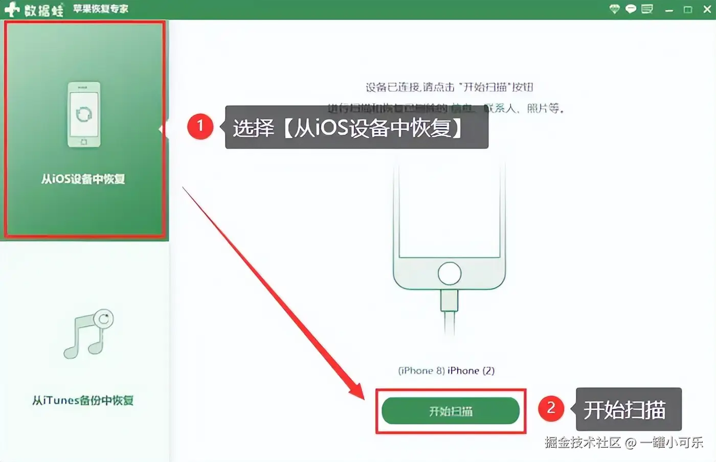 第2步:打开软件,选择 【从iOS设备恢复】 功能。软件将自动识别你的设备,并提示你开始扫描。点击 【开始扫描】 按钮,软件将开始全面扫描你的苹果设备,寻找可恢复的数据。