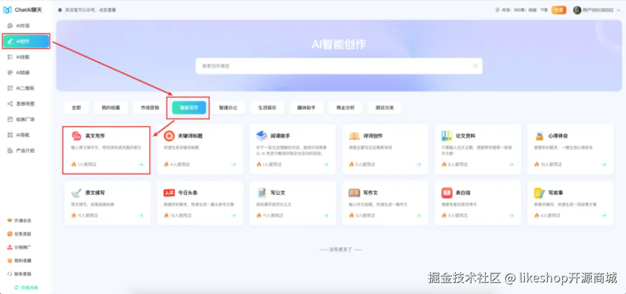 打开ChatMoneyAI的AI聊天绘画系统,选择AI创作-->智能写作-->英文写作