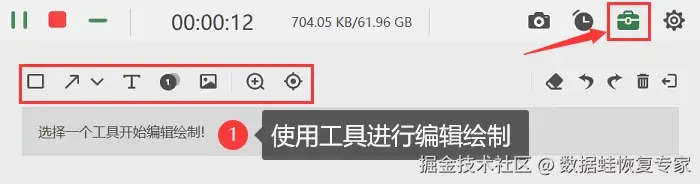 步骤3:录制过程中,可以点击使用 【工具箱】 里的工具对视频进行即时的编辑与绘制,让您录制的视频内容更丰富更有趣。