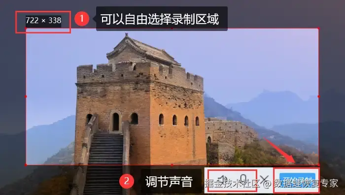 步骤2:使用热键 【Ctrl+Alt+S】 打开录屏功能,对录制区域和录制声音等进行调整,点击 【开始录制】 进行录屏。