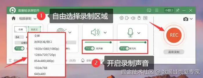 步骤2:在 【视频录制】 模式中自由调整录制的区域,比如全局录制或者自定义区域。对摄像头、录制声音进行调整后,点击红色按钮 【REC】 进行录屏。