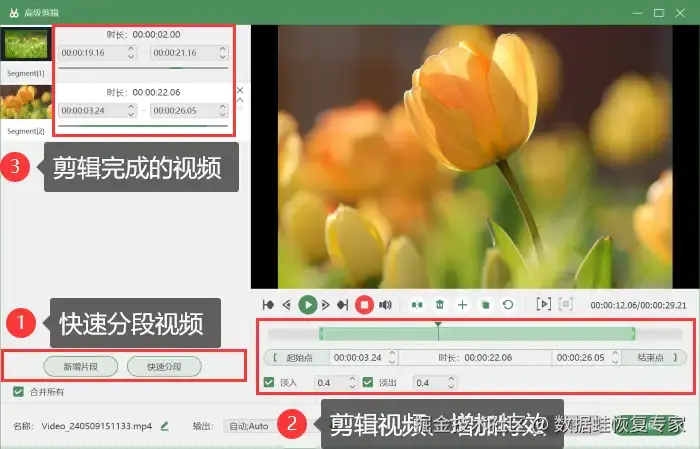 步骤4:结束录屏后你可进入 【高级剪辑】 页面快速分段视频,或者对视频进行剪辑、增加特效等操作。