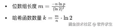 - 哈希函数数量(K) :哈希函数的数量也需要根据集合大小和位数组长度来确定。