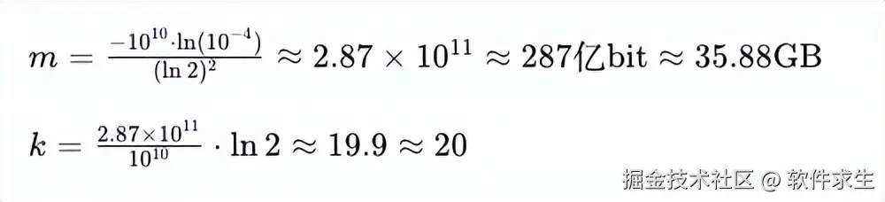 假设我们允许的误判率为0.01%,我们可以使用以下公式来计算m和K: