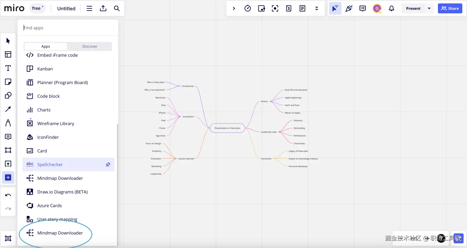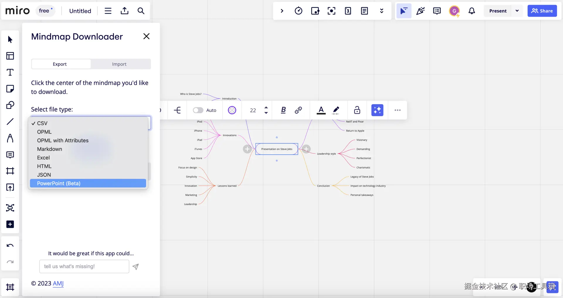 打开安装的Mindmap Downloader插件,然后选中Miro白板上的思维导图,接着在插件面板选择PowerPoint格式,就能将思维导图一键转换为PPT文件。