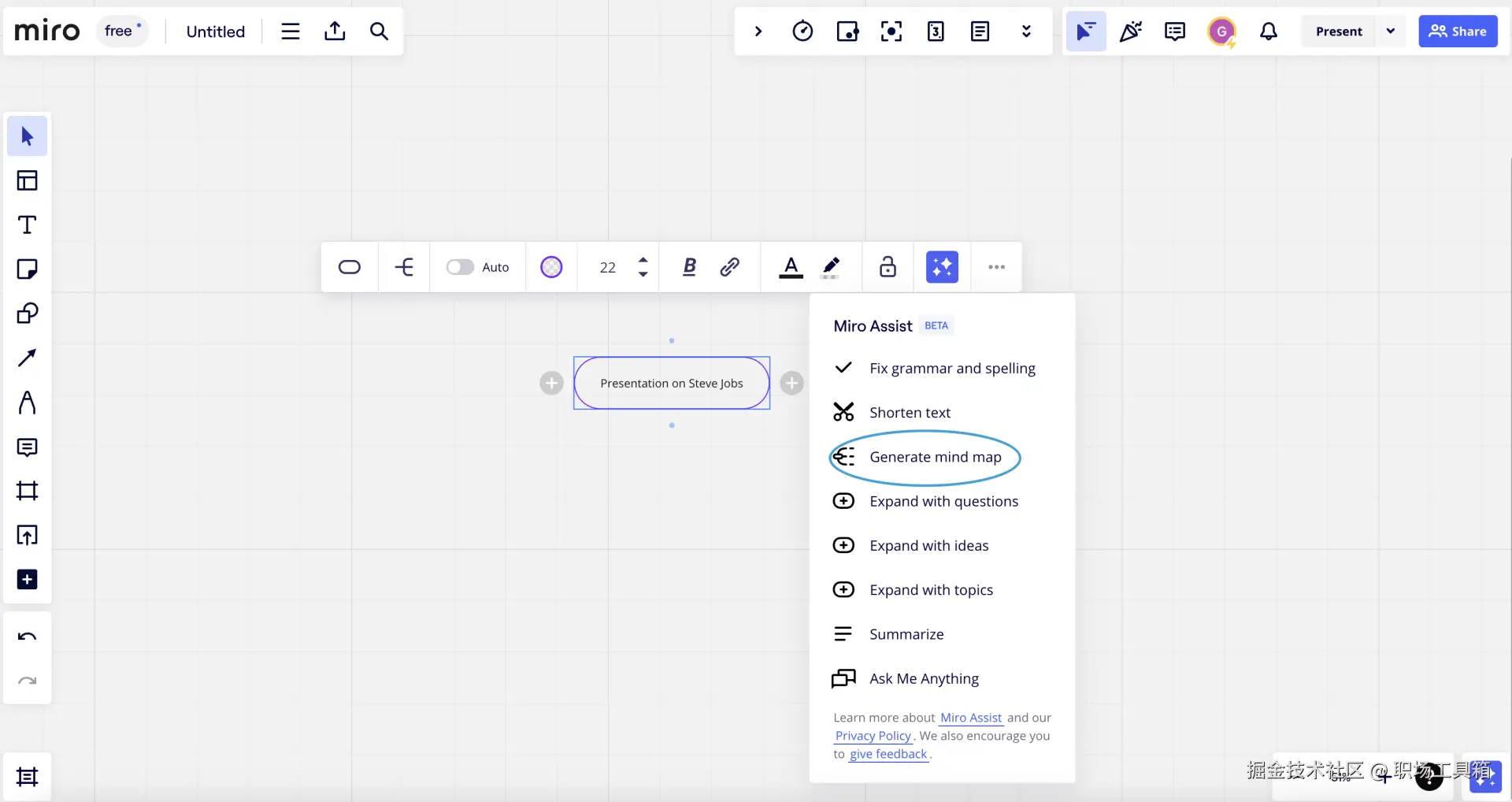 使用Miro的思维导图工具,在白板插入导图节点,输入PPT主题,选中导图节点,点击右上角的Miro AI图标,打开Miro AI面板。