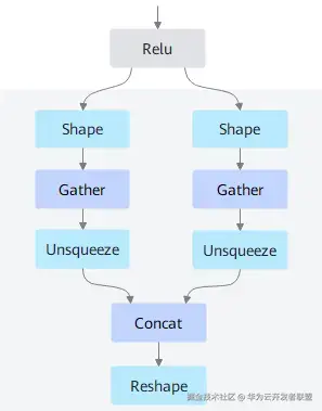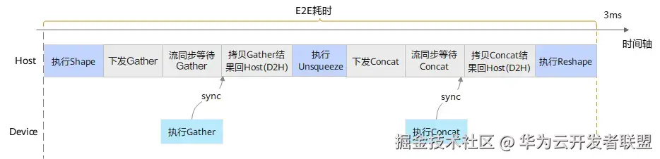 图1是一段网络拓扑片段示例,按照一般的调度机制,Gather、Concat算子会下沉到Device侧计算,Shape、Unsqueeze、Reshape算子在Host侧计算。其执行时序如图2所示,模型E2E执行耗时除了包含算子计算的时间外,还包含Host与Device之间的数据拷贝、算子下沉调度、Stream同步等开销,整体执行E2E耗时在毫秒级别。