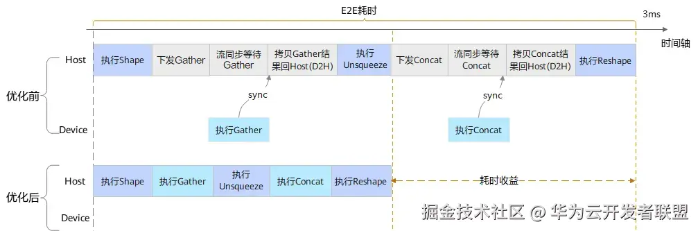 在图编译流程执行到引擎选择之后,GE选择在Host侧执行的算子并将其作为锚点,然后向后递归查找计算数据个数小于8的算子,并将这些算子的执行引擎修改为Host CPU。针对图1所示的网络片段,假设shape算子的输出的shape size小于8,则Gather、Concat算子的执行引擎都会被刷新成Host CPU。优化后执行时序如图3所示,此时模型执行只有算子计算带来的开销,经测试约为10微秒(3ms –> 10us),显著的提高了E2E执行性能。