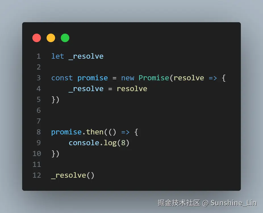 就比如下面例子,我想手动控制 Promise 的 fullfiled 的时机,所以需要把 resolve 给取出来,然后在我觉得适当的时机去执行这个 resolve,这样 Promise 就变 fullfiled 了