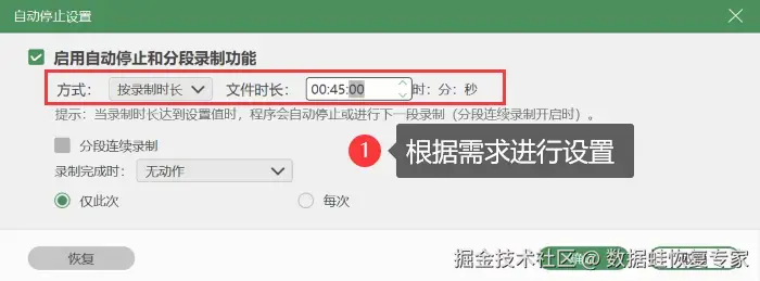 步骤4:可以通过点击 【自动停止】 设置录制任务,让您节省时间的同时也不会错过屏幕上的精彩瞬间。