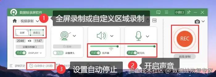 步骤3:在 【视频录制】 页面设置录屏录制区域(支持全屏录制和自定义区域录制),调节声音大小等,然后点击 【REC】 按钮开始录制。